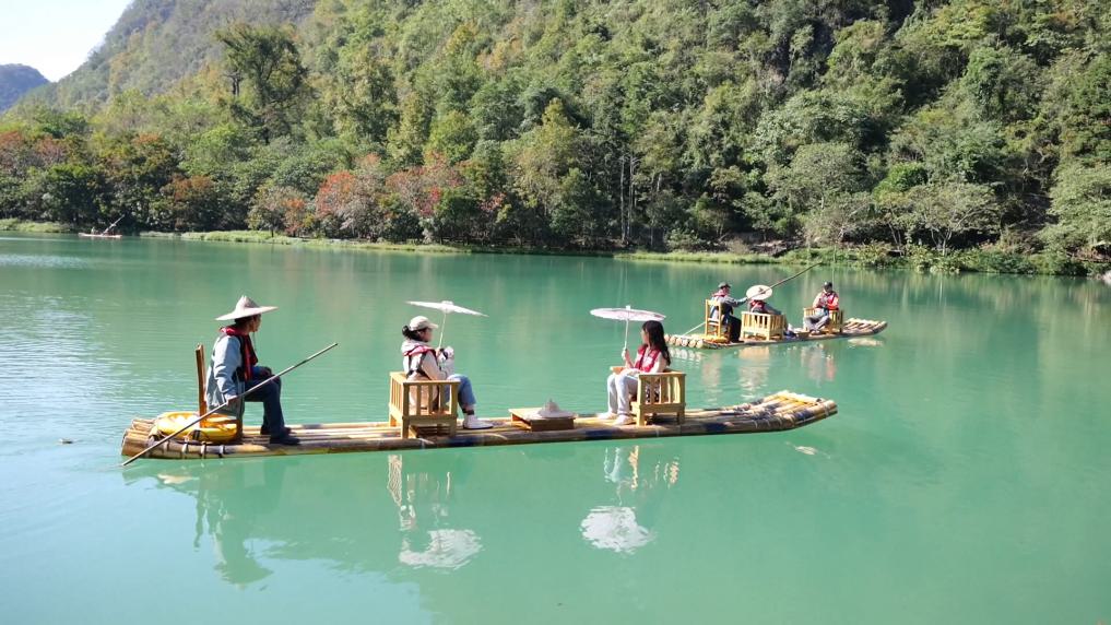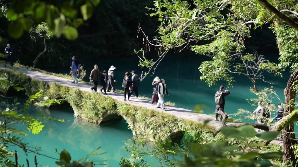 走进荔波小七孔景区,绿意盎然、活水潺潺。游东谈主在古桥上散步,用镜头定格这山水相依的好意思景。在翠谷湿地,阳光散落湖面,搭客不错乘坐竹筏,尽享一段清闲时光。